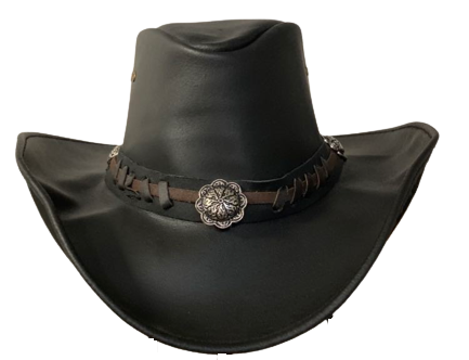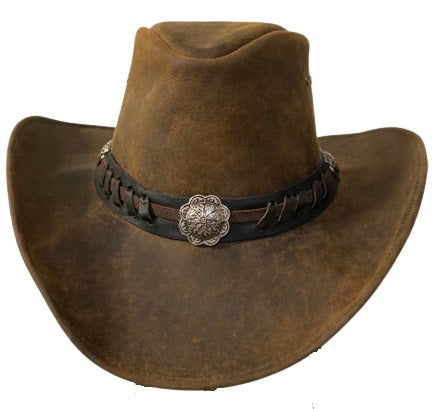 The Woodville is a shapeable cowhide leather hat with a lowered pinched crown, medium brim with ventilation eyelets, hatband with handwoven leather trim and decorative conchos. The hat is fitted with a built-in chinstrap facility.