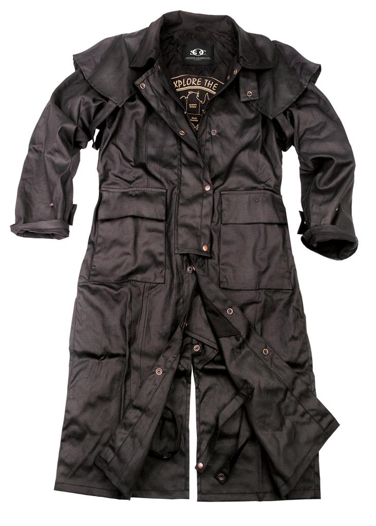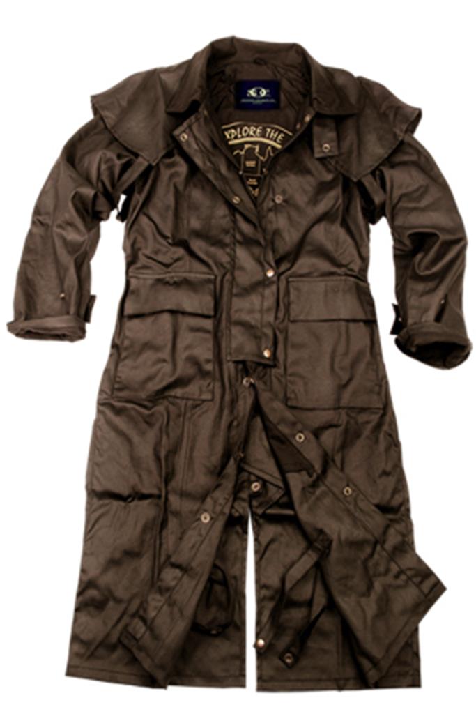 As the name implies, this is our work horse, all meat and potatoes. We used our 12oz traditional MicroWax oilcloth with a corduroy collar, a draw cord waist, two large bottom flapped patch pockets, and double storm plackets. We threw on a detachable cape for added protection, dropped in a back fantail and riding straps and added adjuster tabs to the cuffs. Inside, we printed a stencil map of Australia on the upper cotton buggy lining so you wouldn't get lost on the way to work, and like all our drovers coats include the usual two built-in internal security pockets and a button-in liner facility for optional liners.