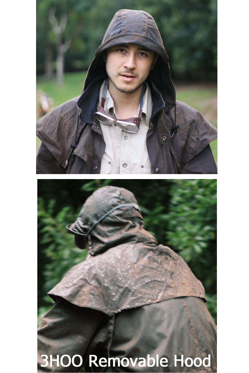 The hood is a great option for many of our Kakadu drover jackets or coats. The style numbers are 5J05, 5O01, 3O02, 2O10, 4J02. These styles have the detachable snap on capes, so to attach the hood you only have to place the hood loops that are at the bottom of the hood, detach the first right side cape snap and place the hood loop between the snap, then re close the snap. Continue on to the next snap and repeat the process until all 4 loops are connected. Done deal, you're covered!