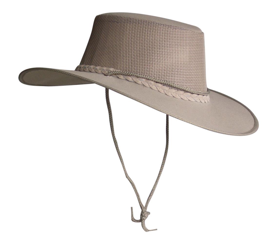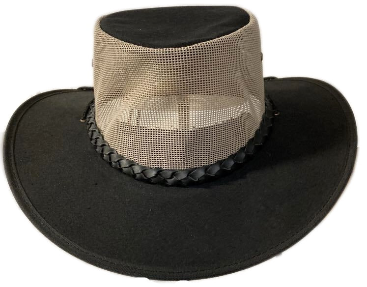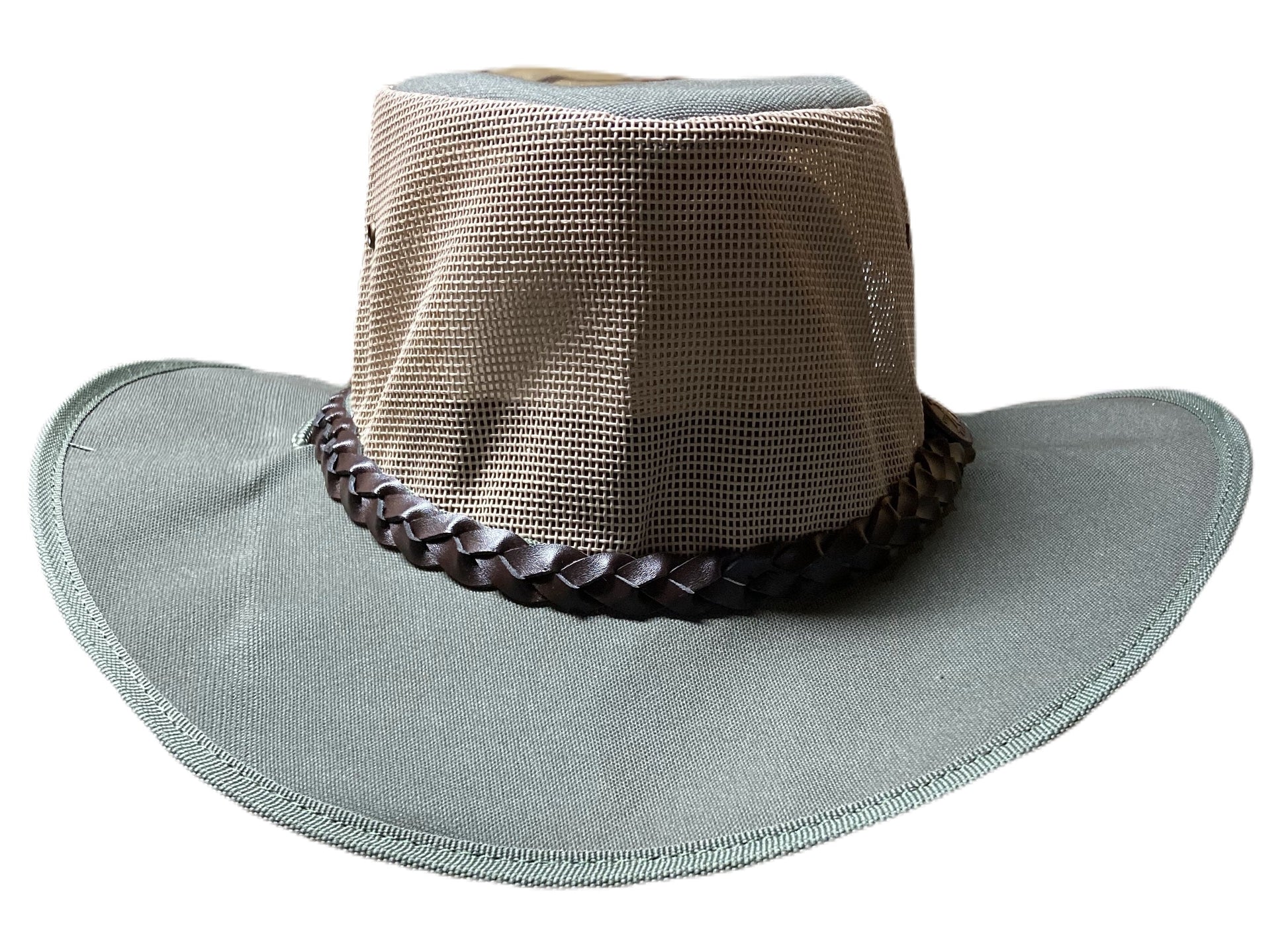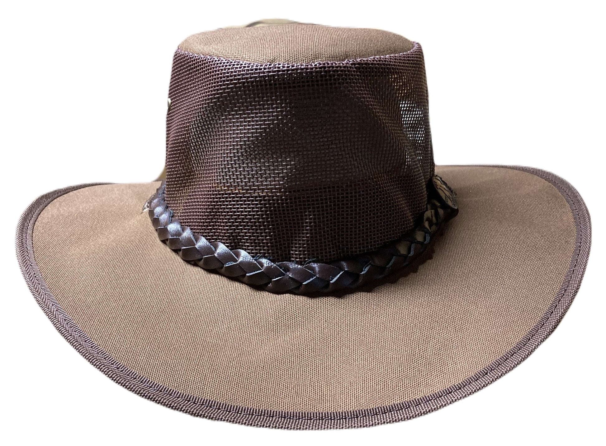 A very light coated canvas makes up the cap and brim. Then we meshed the sides (crown) so breeze can flow straight through. We used a synthetic mono filament (real thick fishing line) to hold the brim which is pliable enough to folds away when you are traveling. Other features are the three strand hand braided hat band with back tassels and draw corded chin strap.
