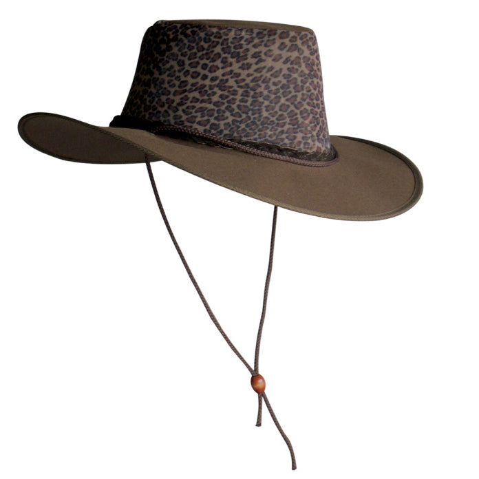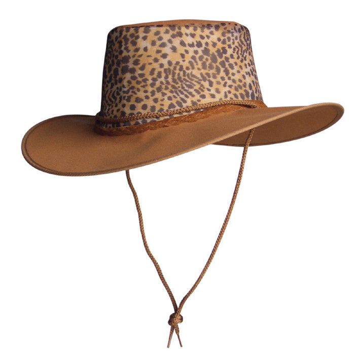 - When it's hot out, release the animal within. This is an ultralight wide brim hat made with ventilating leopard print mesh to keep you cool. The water resistant canvas is rated with an Ultraviolet Protection Factor of 50+. Fitted with a built-in chinstrap.