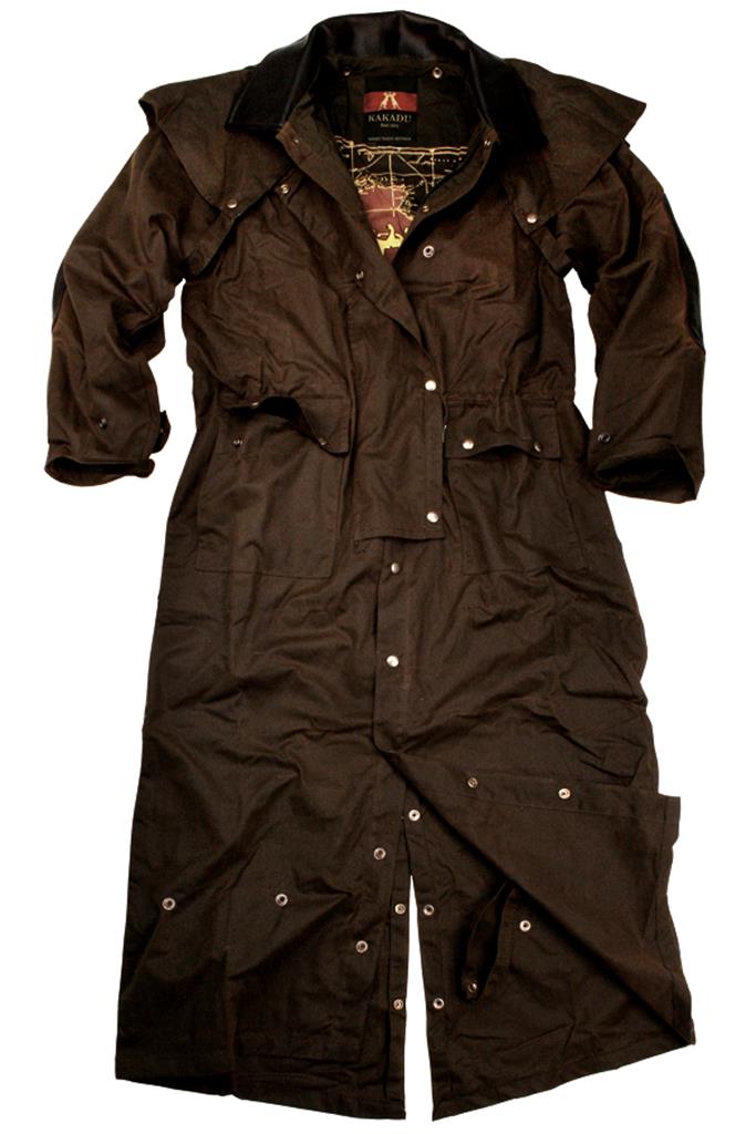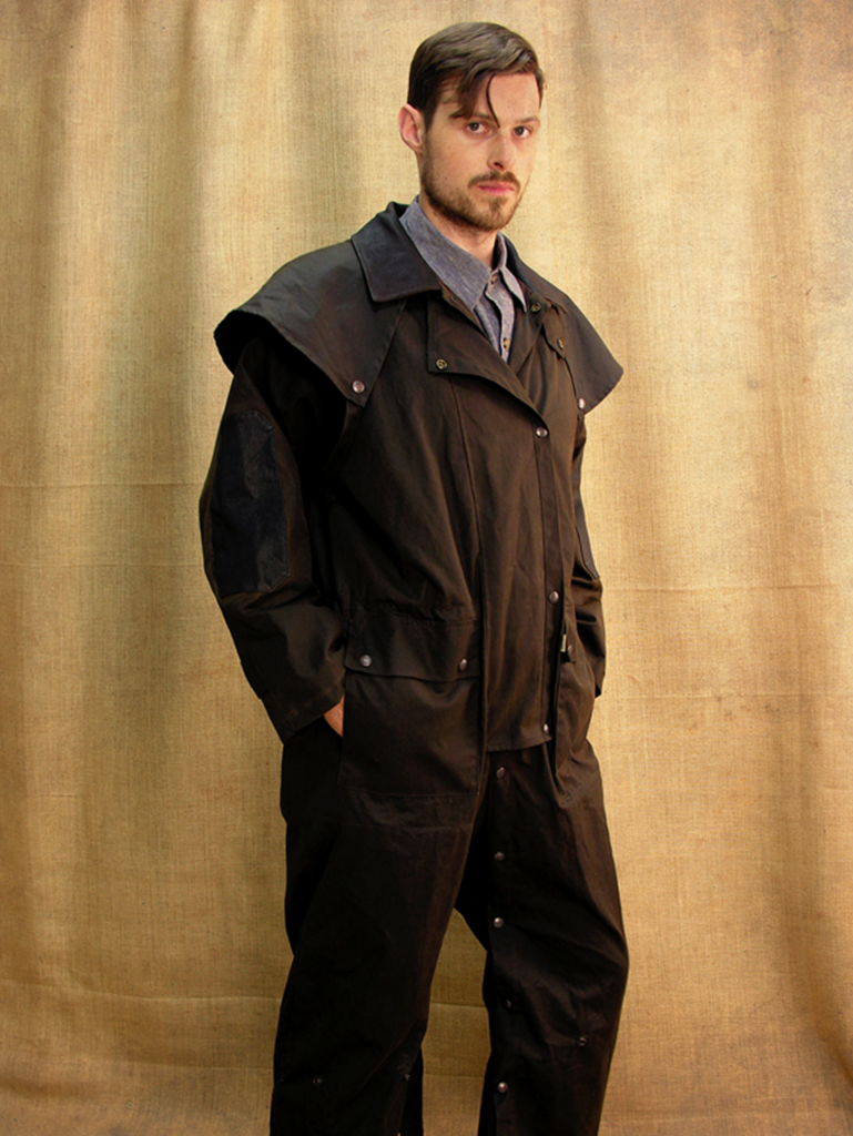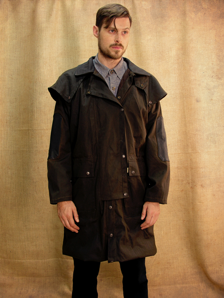 This versatile multi-functional drovers coat is constructed with our classic MicroWax oilcloth accented with cowhide leather trim. In its original state, the extra long length means you're protected from the ground up and when converted to coveralls it easily slips over your boots so your tootsies stay dry. For those times when its warmer or you need extra movement in your legs, the Long Rider snaps up to a 3/4 length jacket.