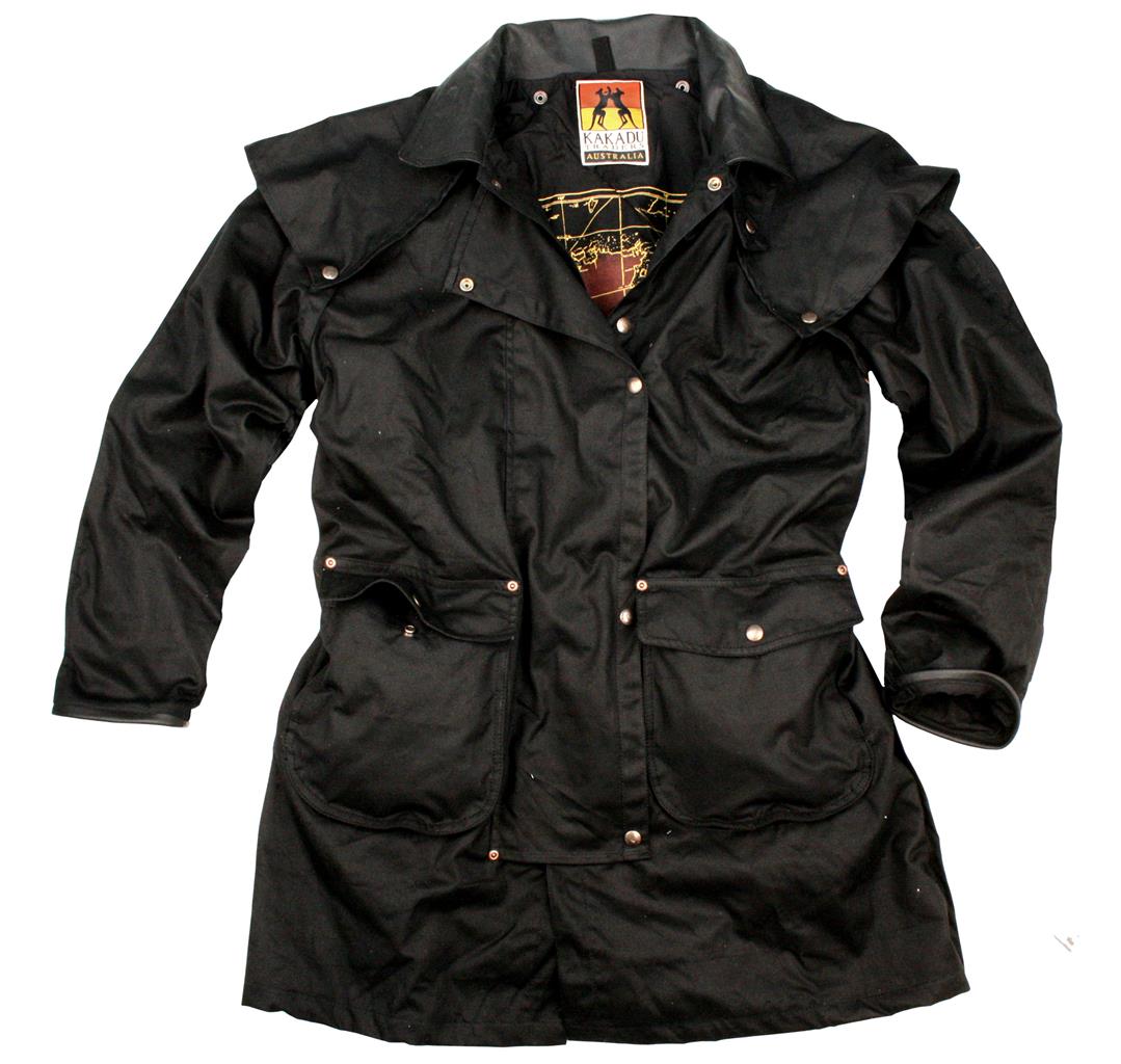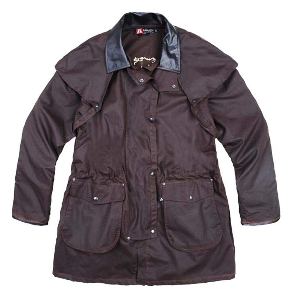 Move over, it's the Iron Bark Drovers Coat's little brother! With all the goodies already built in: brass hardware, cowhide collar and cuffs, detachable cape, double snap down storm plackets, bottom front riveted, snap-down flaps over the large bellow pocket bags cover side entry hand warmer pockets. This MicroWax oilcloth garment is lined with 100% cotton, stencil printed, with two internal security pockets and our unique button-in lining facility. (Button-in liner vests and jackets sold separately). At the bottom of each front there are large double mesh internal storage pockets. The back of the coat features snap up double back vents.