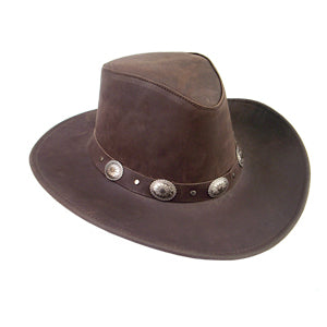 The RAZORBACK is a leather hat with a relaxed, comfortable handle complemented by embossing techniques to attain a subtle aged effect. The hat has a mid high pinched crown, shape-able medium brim, and a hatband with traditional American conchos.