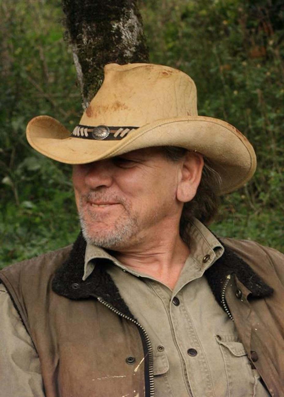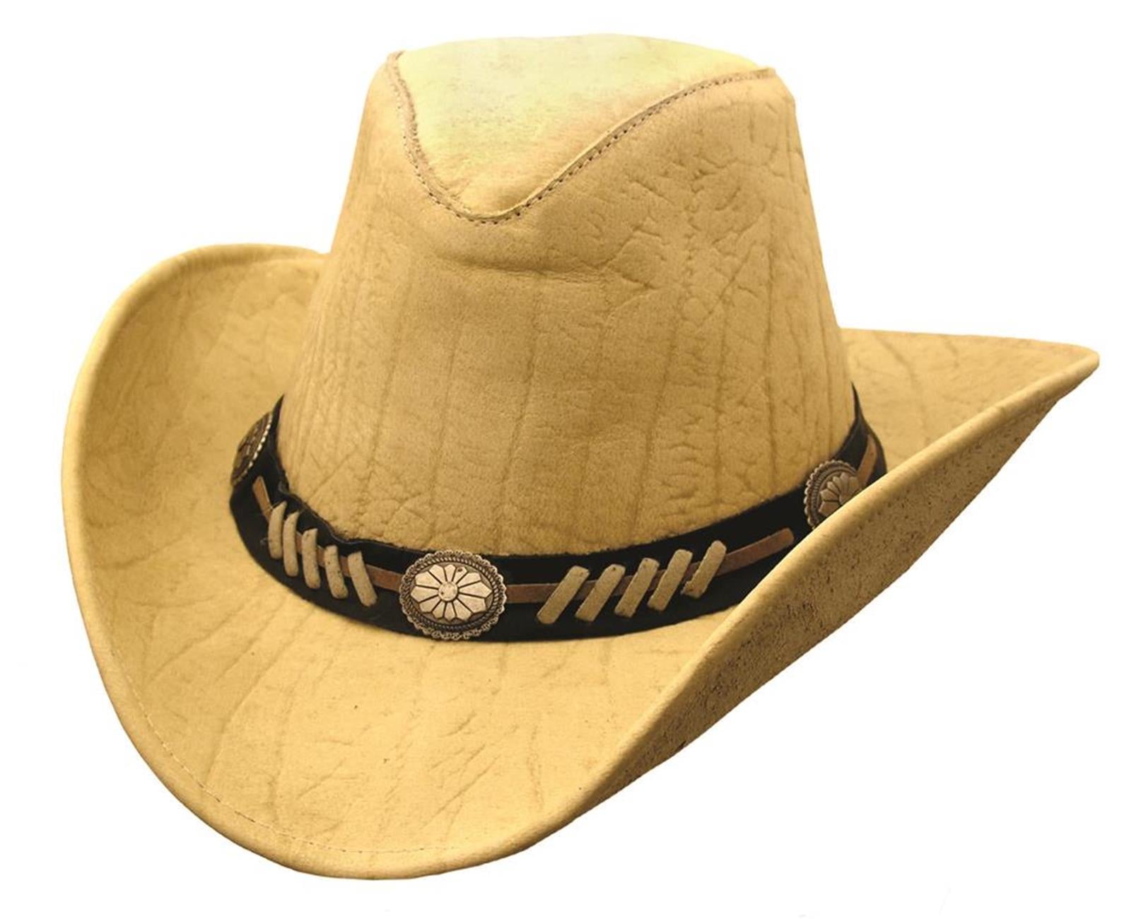 The STAMPY is an embossed leather hat with a mid high pinched crown and shape-able medium brim. The hatband has a concho with leather handwoven trim.