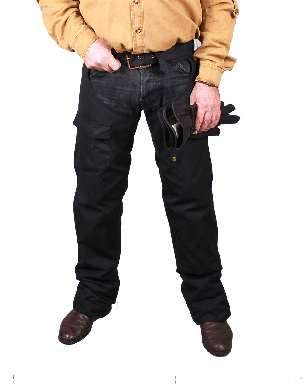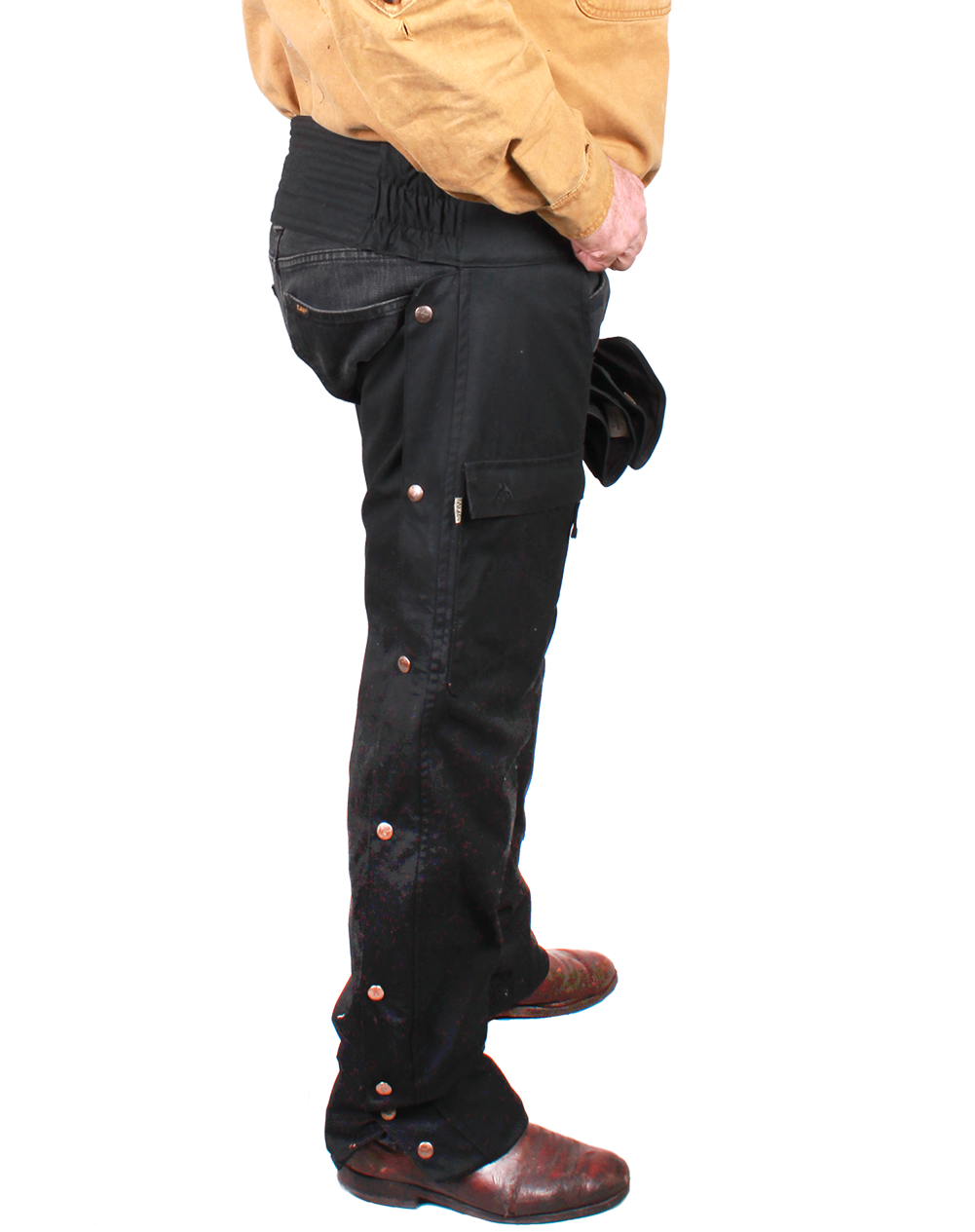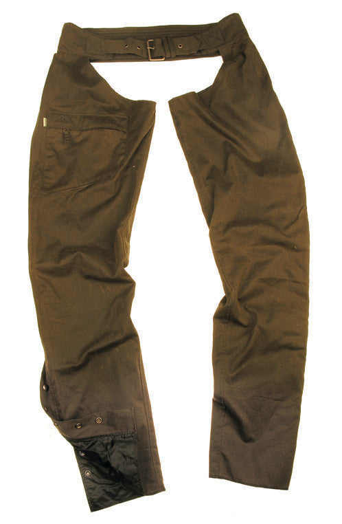 If you were born to ride - bikes, horses, bulls or whatever - these are what you need. Our VENTILATOR CHAPS are built out of our MicroWax oilcloth for rough weather and ease of cleaning. Padded back strap, elasticized on the side with thick webbing front belt. There's a right side thigh security pocket and full outer leg brass zip closure covered by snap down storm plackets. Wicker lined for better slip. The chaps are built with extra-long leg length for riding position, you just trim to you length.