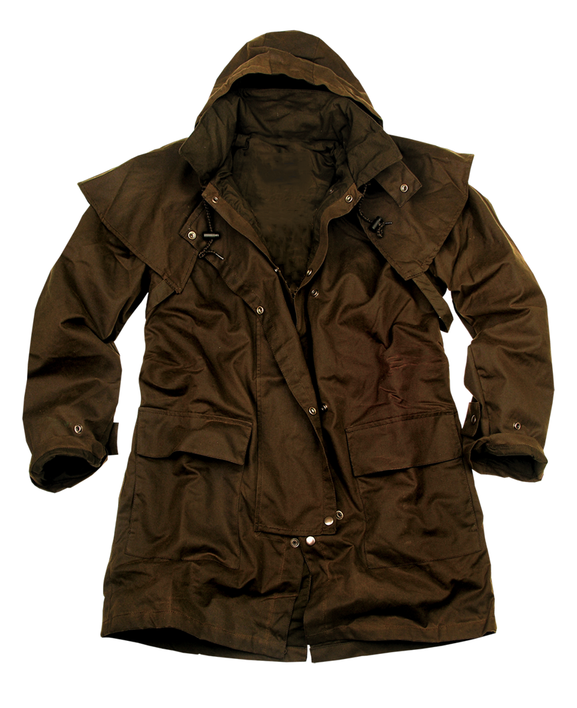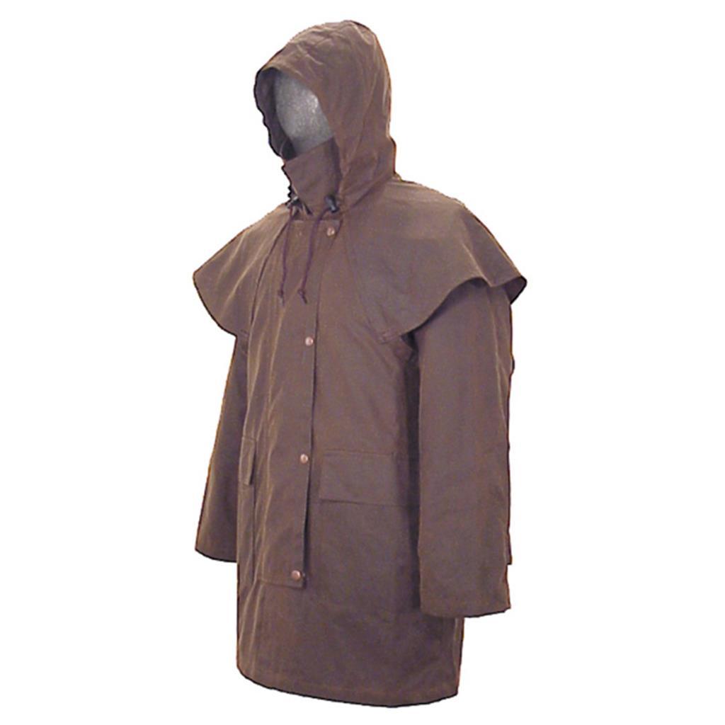 Built for the same purpose as the long drovers coat, pure function and features much the same only in a 3/4 jacket length. Two internal security pockets. Hood rolled into the collar. Double snap down storm plackets cover the front snap closure. Draw corded at the waist, full shoulder cape, adjuster sleeve tabs and bottom front flapped patch pockets that cover hand warmer pockets. Double back vents for riding everything.