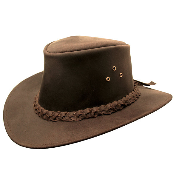 Oiled Buffalo hide leather! The IRON COVE HAT is for the working bloke. Higher crown for maximum air circulation, triple eyelets, traditional three strand hand braided hat band, and built in chin strap placement so you can add your own chin strap. We even added a few tassels at the back to keep the flies off the back of your neck.