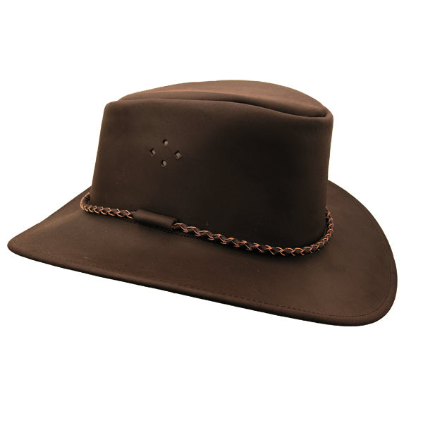 The SYDNEY is a leather hat with a high rounded crown, perforated ventilation holes, round braided hatband and a medium brim. Like most Kakadu hats it is rated with a UPF of 50+ and is fitted with a built-in chinstrap facility.