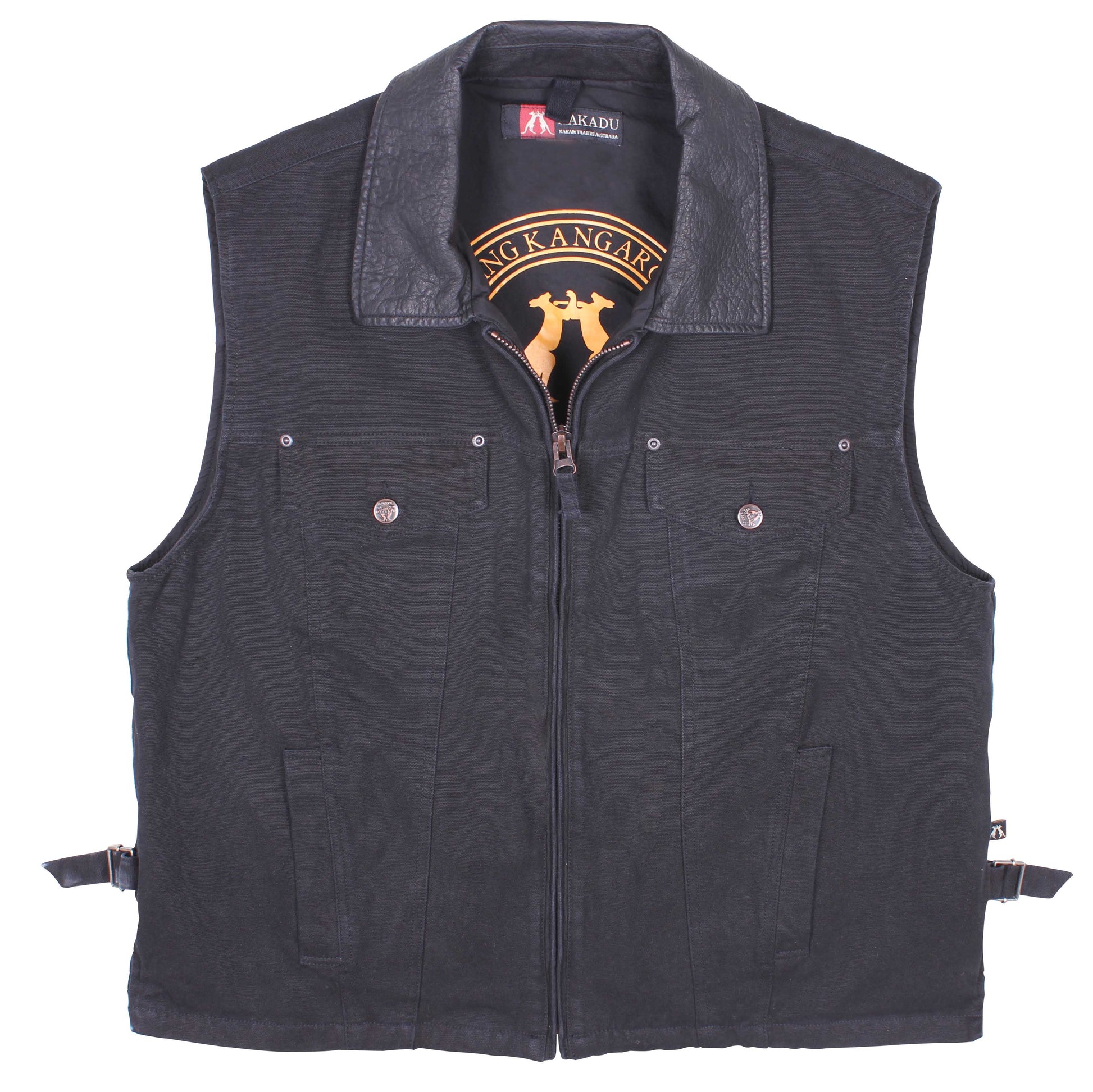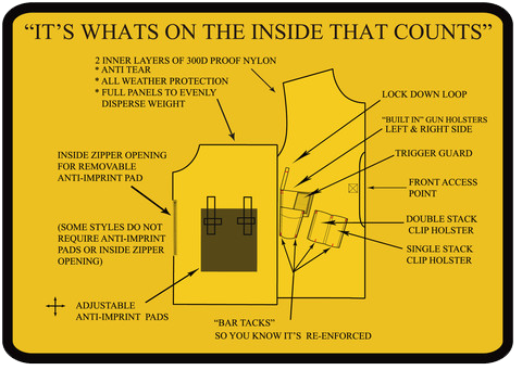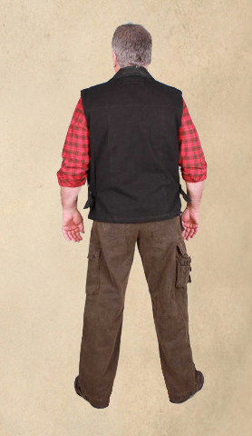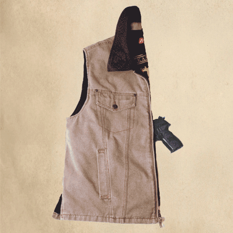 The KELLY '12' VEST features a cowhide leather collar, brass zip front closure, double front yokes, chest flaps covering welted pockets, side entry pockets and paneled back with side adjustable tabs. Inside it is black cotton lined with a stencil print that covers the Gunn Worn concealed carry internal system (CCIS) and comes with the Gunn Worn anti-imprint pads.