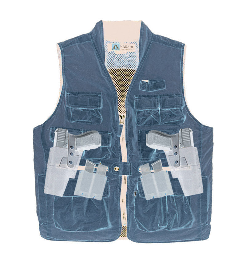 Like its cousin the Gibson Ventilator, the CAPE CONRAN VEST is loaded with more pockets than you can poke a stick at - 17 to be exact. Featuring 9 front patch pockets, 2 front zipper storage pockets, 2 side entry hand-warmer pockets, 2 internal security pockets and last but certainly not least, the internal left and right handed holster pockets. Fish netting back maximizes air flow. Light but tough 5 oz washed MicroWax oilcloth cotton canvas shell. The front is cotton lined and covers the Gunn Worn Concealed Carry Internal System (CCIS).* Anti-imprint pads are not required as the 13 external front pockets distort any imprinting.
