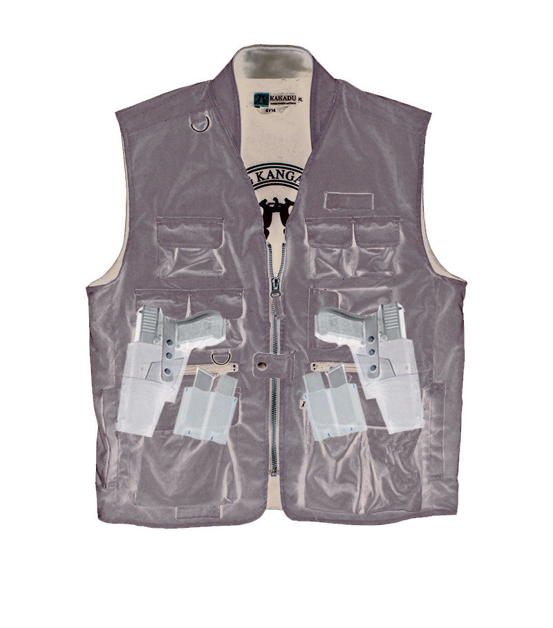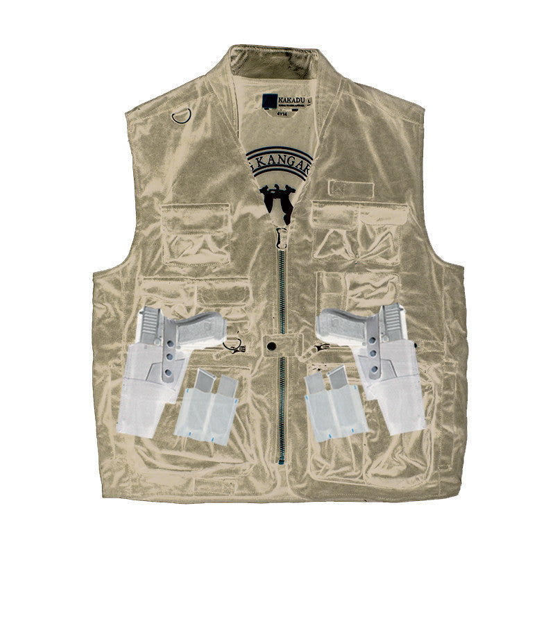 - For the avid outdoorsman or all weather adventurer, the GUNN-WORN TRAVELLER VEST is built using Kakadu's traditional 12oz oilskin for bad weather protection and features 18 multipurpose pockets to ensure that you've always got the right tools on hand. It sports 9 front patch pockets, 2 front zipper storage pockets, 2 side entry welt pockets, 2 internal security pockets, last of all are the 2 internal Gunn Worn Concealed Carry Internal System (CCIS) holster pockets that are built in for your protection. Features brass zip closure and cowhide trim.