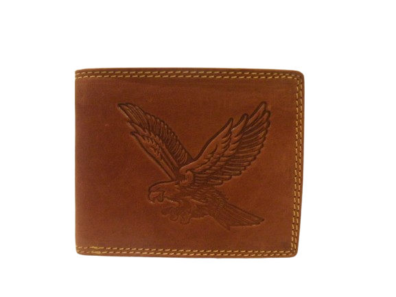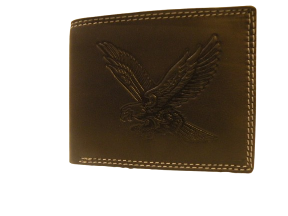 The Eagle Flight wallet is a buffalo leather wallet embossed with an eagle in flight. Features 2 currency slots, 12 card slots, 2 hidden pockets, 1 window ID/Photo slots, and RFID protection. Measures 4.5 inches long when closed, 3.5 inches high.