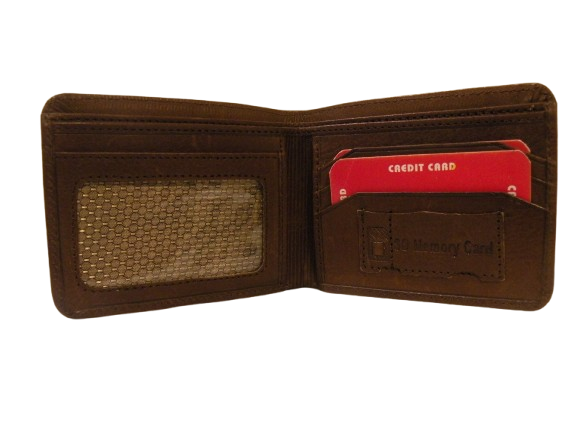 The Wyborn wallet is made from a textured buffalo leather. Features 2 currency slots, 3 card slots, 2 hidden pockets, 1 window ID slot and a special pocket for an SD memory card! Measures 4.5 inches long when closed, 3.5 inches high.